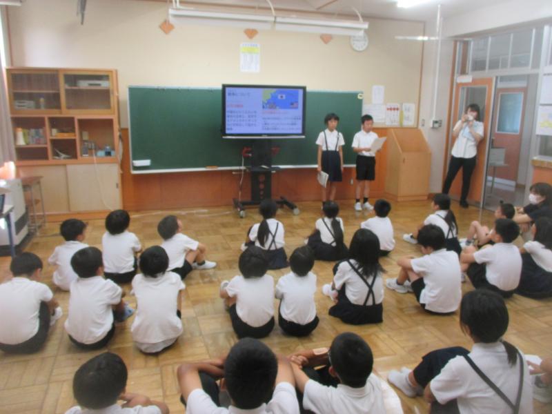 8月6日に平和集会がありました。5・6年生は町の方から教えてもらった戦時中の話をまとめ、1~4年生に発表していました。