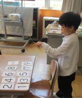 算数、1~10までの数の学習です。カードを使って大きさ比べをしたり、順にならべたりしていました。カードならべでは、いろいろな並べ方があることに気づいていました。