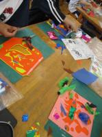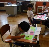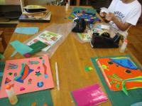 さすが高学年です。自分の作品と向き合いながら、表したい感じになるように、切り方や重なり方を工夫しています。「ここ素敵!!」と伝えると「〇〇のパクった。」と申し訳なさそう。いやいや、真似をしたっていいんです。「いいな~!」と思ったから、真似をしたんだよね。ちゃんと自分の考えがもてたんだよ。そこからまた新しいアイデアもきっと浮かんでくるね。