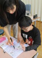 クレパスで色をぬったあと、紙でこすり「のばしたり」「ぼかしたり」する技法をつかって絵をかいていました。この前の遠足のことを思い出したり、自分のすきなものを描いたり、3人でおしゃべりしながら、描きたいイメージを膨らませていましたよ。