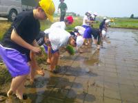 5・6年生が田植え体験をしました。手で植えるたいへんさを感じながらも、やり終えて笑顔いっぱい達成感いっぱいの5・6年生でした。また、いつもおいしいお米が食べられるのは、暑い中お米を育ててくれている農家のみなさんのおかげだということにも気づいていたようです。体験後の感想でも「もっと感謝して食べたい。」という声がたくさんありました。ご指導いただいた下出様ありがとうございました。