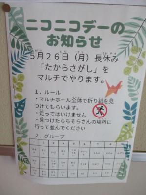東谷口小学校では、毎月25日を「ニコニコデー」でとしています。児童会の企画委員会が中心となって、長休みに全校みんなで遊びます。今日は、縦割りグループで「たからさがし」をして遊びました。整列、やり方の説明、司会進行はすべて企画委員会の子どもたちです。頼もしいですね。3人一組の縦割りグループでは、高学年が低学年を優しくリードしてくれていましたよ。高学年のおかげで「たから(手作り折り紙)」を見つけることができた低学年は大喜びでした。