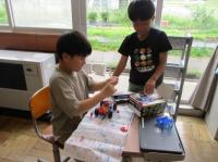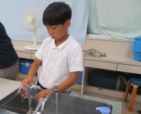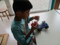 学習のまとめとして、「電池で動く車」をつくっていました。より速く動くにはどうしたらいいか、友達と相談したり自分で考えたりしながら改良していました。最後には広い体育館で思いっきり車を走らせていました。