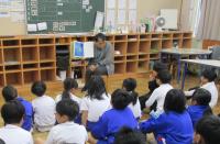 避難訓練のあとは、教育委員会の方から「クマにあわないために」「万が一クマにあったら」どんな行動をとるとよいのかについてお話していただきました。みんな真剣に話を聞いていました。