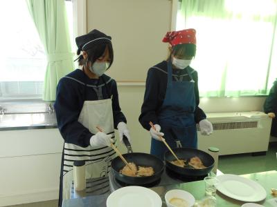 今日は、1年生の家庭科の授業で、豚の生姜焼きの調理実習を行いました。2人1組になり、調理する人とサポートする人に分かれて、互いに助言や補助をしながら、準備から後片付けまで協力して取り組みました。