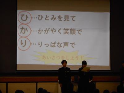 後期生徒会初めての自主自立集会が行われました。新しい取組として「ひ・ひとみを見て か・輝く笑顔で り・りっぱな態度で あいさつしよう!」と呼びかけ、あいさつのモデルを示してくれました。光野中の生徒がより明るいあいさつを交わし、気持ちよく毎日を過ごすことができるといいですね。また、各委員会・各学年CL会からも取組の紹介や呼びかけがありました。