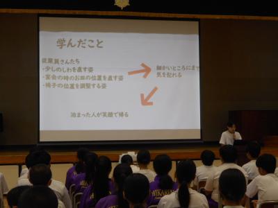 7月に取り組んだ職場体験の報告発表会がおこなわれました。みんなよくまとめられていて、それぞれの職場での様子がよく伝わりました。