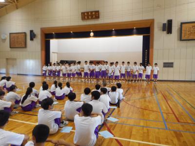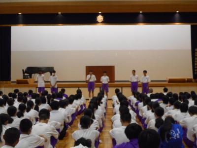 今日は月に一度の「自主自立の日」でした。生徒会からは7月の団対抗あいさつ運動の表彰がおこなわれました。また、各委員会・CL会からは今月の取り組みについて全校生徒に呼びかけがありました。