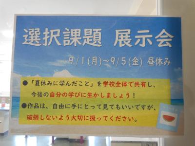 夏休みに取り組んだ選択課題が展示されています。図書館を使って調べ学習した作品や、独自のアイデアを活かした作品など、生徒達のがんばりがうかがえる作品が展示されています。