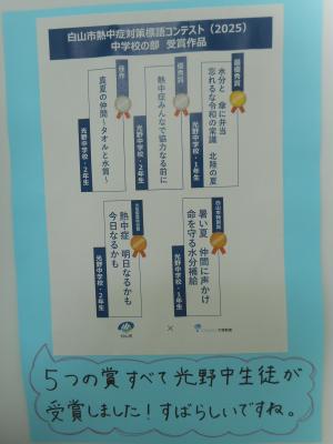 2025年9月3日 15時50分大塚製薬主催の「熱中症予防標語コンテスト」で光野中の生徒が5つの賞を受賞しました。素晴らしいですね!9月とはいえまだ暑い日が続きます。水分補給、お互いに声をかけながら熱中症にならないように気をつけていきましょう。