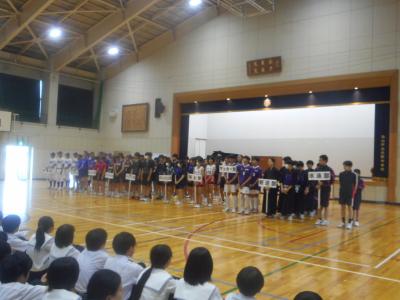 今週末に始まる県体予選大会・加賀地区大会やコンクールの激励会がありました。吹奏楽部の演奏で入場した後、各部が意気込みを述べました。その後、1・2年生のCL会代表、生徒会長から激励の言葉がありました。校長先生からは「これまで取り組んできたことを形にする大切な機会です。それぞれの場所で、皆さんらしい力を十分に発揮してください!」と激励の言葉がありました。