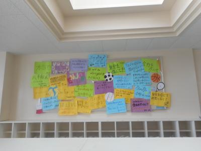 生徒玄関には、教職員からの応援メッセージが掲示されています。がんばれ!光野!みんなで応援しています。