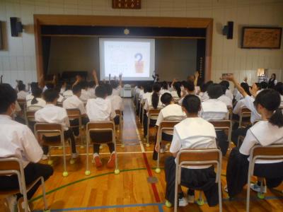 今日は白山市立蕪城小学校栄養教諭 國雲氏をお迎えし、「中学生の食育 体力向上・学力向上を目指して~今日から始められる食のステップアップ~」と題して1年生の食育講座を開催しました。1.給食の活かし方、2.朝食の大切さ、3.これからの食事について、事前に取ったアンケートの結果やクイズを入れながらわかりやすくお話しくださいました。