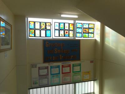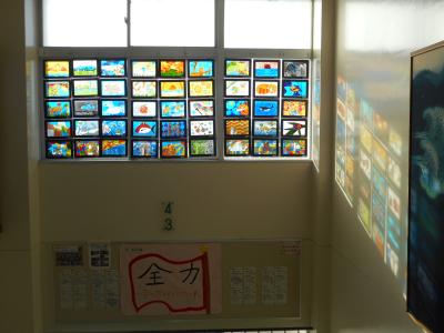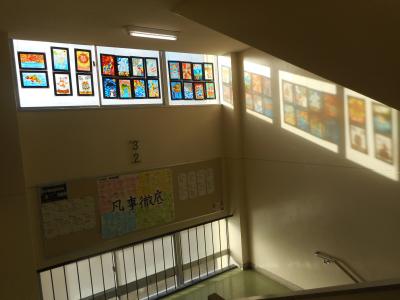 3年生が美術の時間に制作したステンドグラス風の切り絵が学校の階段窓を彩っています。日が差すと絵が壁に反射してとても美しいです。