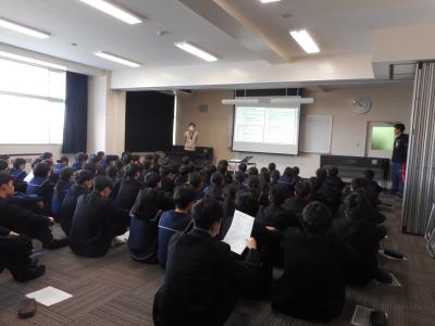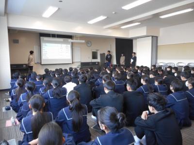 明日は石川県内の私立高校入学試験がおこなわれます。本校の3年生の多くの生徒が受験します。今日は、校長先生から激励を受け、担当教諭からの説明を聞きました。生徒達は緊張した面持ちでした。