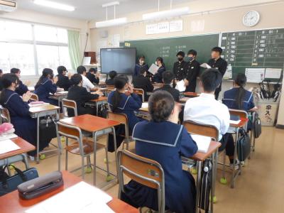先日の高校の先生に聞く会で学んだことを、それぞれのクラスでグループごとに伝達する会が行われました。自分が直接聞くことができなかったお話の内容も少し知ることができました。これから色んな高校の情報を集めて、進路選択の幅を広げていけるとよいですね。