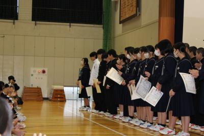 今日は2年生の学年朝集会が行われました。3年生を送る会で2年生が担当するクイズの問題をCL会(クラスリーダー会)が呼びかけたり、5月に行われる修学旅行の実行委員会が、自己紹介のあとスローガンを紹介したりしました。修学旅行のスローガンは"Memories=Treasures"(思い出は宝物)です。これから色々と準備し、修学旅行を充実したものにしたいですね。
