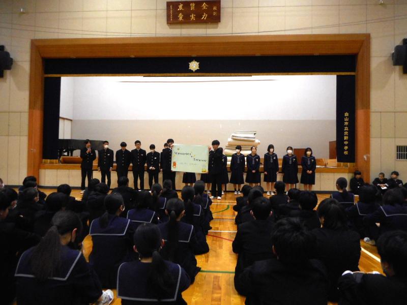 2025年1月16日 08時26分今日は2年生の学年朝集会が行われました。3年生を送る会で2年生が担当するクイズの問題をCL会(クラスリーダー会)が呼びかけたり、5月に行われる修学旅行の実行委員会が、自己紹介のあとスローガンを紹介したりしました。修学旅行のスローガンは"Memories=Treasures"(思い出は宝物)です。これから色々と準備し、修学旅行を充実したものにしたいですね。