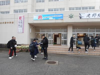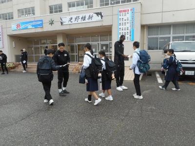 石川県を拠点に活動しているプロバスケットボールチーム、金沢武士団Kanazawa samuraiz が本校を訪れ、7:45~8:10にあいさつ運動をおこないました。今週末、松任総合運動公園体育館でおこなわれる試合のチラシを配りながら、「良かったら見に来てね」と声をかけながら笑顔であいさつをしていました。