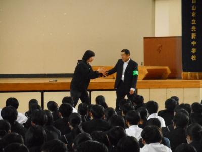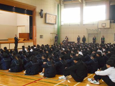 全校集会では校長先生が「皆さんのあいさつは礼儀正しさを示すだけでなく、不審者の行動を抑制する効果がある。あいさつを習慣づけることが身を守るための最初の防御となる」と話しました。