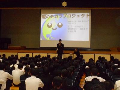 今日は11月の自主自立の日でした。後期生徒会役員、クラスリーダー、各委員長から今月の活動や取組について全校生徒に話がありました。