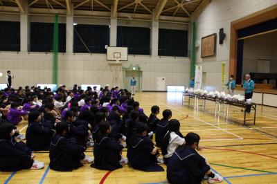 11月8日(金)放課後、1・2年生を対象に「おにぎりの日」が開催されました。これは育ち盛りの中学生にお米をたくさん食べてほしいというJA松任から、百万石のお米のシャケにぎりを一人1個配布していただくものです。代表理事組合長から石川のお米のおいしさやたくさん食べてほしいというお話をうかがった後、みんなでおにぎりを味わいました。これからもお米をたくさん食べて、勉強に部活動に力を注いでほしいですね。