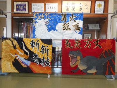 運動会の応援団の団旗が仕上がりました。赤団 気炎万丈(きえんばんじょう)、青団 篝火狐鳴(こうかこめい)、黄団 斬新奇抜(ざんしんきばつ)という団のテーマをイメージしたデザインでどれも勢いのある素晴らしい団旗となりました。団旗係の生徒達が夏休みから時間をかけて制作しました。