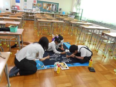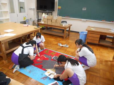 9月に行われる運動会に向けて団旗の制作が始まりました。どの団も、勇壮で美しい図案をもとに丁寧に描いていました。でき上がりが楽しみです。