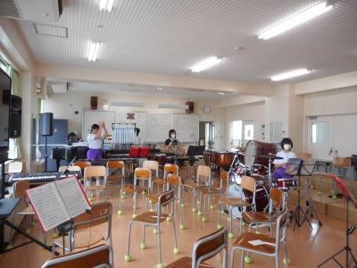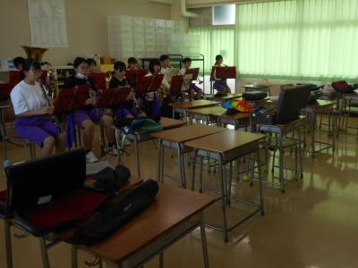 8月9日の定期演奏会に向けて、吹奏楽部は日々練習に励んでいます。前半はパートごとに分かれて細かい打合せをしたり、練習したりしています。1年生は教師の指揮に合わせて合奏していました。
