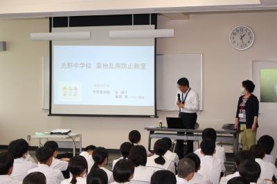 今日は、学校薬剤師 谷 順子氏、アルプ薬局薬剤師 蕪城 博氏をお迎えして3年生の薬物乱用防止教室が行われました。