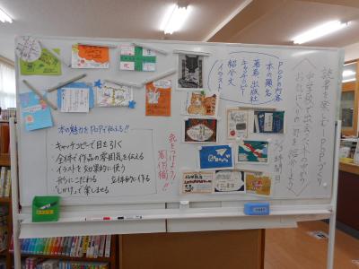 3年生国語で図書館を使った授業を行っています。自分のお薦めの本を紹介するポップづくりです。図書館でお薦めする本を探した後、デザインや文章を考えていました。とても真剣に取り組んでいます。