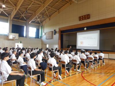 7月4日(木)、大塚製薬の方をお迎えして保健委員会と各部の部長を対象に熱中症講演会を行いました。これから熱中症の危険性が高まる季節、お互いに声を掛け合って安全に学校生活を送っていきたいですね。