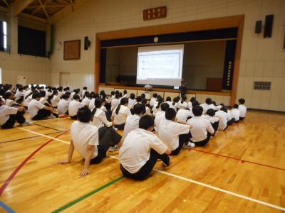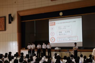 翌日は自主自立集会がありました。保健委員会が、前日学んだことを全校生徒に伝えました。