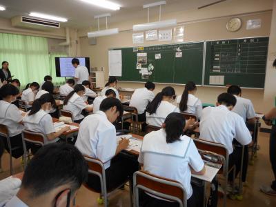 本日、3年1組で英語科、吉田教諭の研究授業がありました。絶滅危惧種の一つであるトキについて書かれた英文の記事を読み、"Do you think that ibises can fly over Japan in ten years?"(10年後、トキが日本の空を飛ぶことができるか)という問いに答える、という課題の授業でした。自分の考えを持ち、友達と意見を交わしながら本文の内容理解を深めていました。