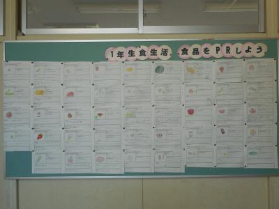 1年生家庭科では一人一食品を選んで調べ、栄養価やおいしさについてPR(ピーアール:宣伝)するレポートを書きました。「これを食べれば元気モリモリになります!」「シャーベットのような食感」など、思わず食欲をそそられるひと言がそえられています。