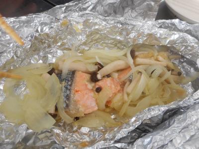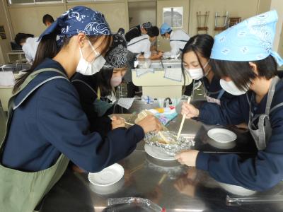 1年生は家庭科の授業で鮭の蒸し焼きの調理実習を行いました。タマネギやシメジと一緒に鮭の切り身を塩、コショウ、、みりん、味噌、バターで味付けし、アルミホイルで包み焼きしました。「うまく火が通っているかな」と、そっとアルミホイルを開けると、湯気とともにとてもいい香りが漂ってきました。