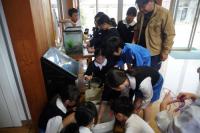 さっそく、5年生が展示用の水槽に入れる手伝いをしていると、低学年や中学年の子も次々と集まり、触ったり、つかまえたりしました。その後、自由観察用の水槽に、スタッフの方に児童玄関に展示してもらいました。5年生が飼育体験をしているドジョウは、中庭で育てていますが、自由観察用の水槽は、児童玄関に置き、瑞穂の自然「邑知潟周辺にいる生き物」に親しんでもらいたいと思っています。