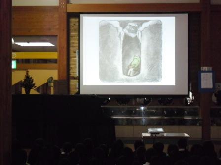 ランチルームに全校が集まり、クリスマスや冬に関するお話を聞かせていただきました。