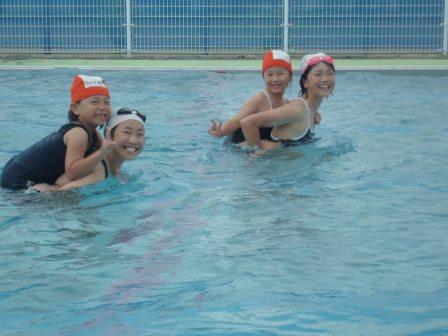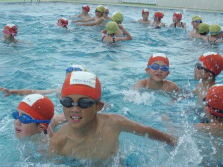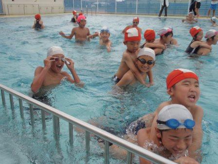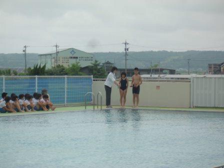 清めの儀式の後、プール使用のきまり、模範泳法と続き、いよいよお待ちかねの入水となりました。はじめに、1年生と6年生が入りました。1年生は、6年生におんぶされてとてもうれしそうでした。次に2年生と5年生が、最後に3年生と4年生が入りました。