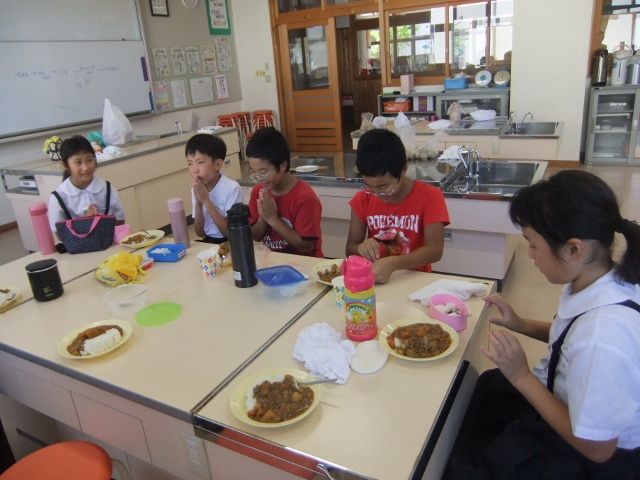 そして,カレーライスができあがりました。自分たちで作ると,苦手な野菜もパクパク食べられました。おかわりをしている子もいましたよ!力を合わせて作ったカレーライス,とってもおいしかったです!