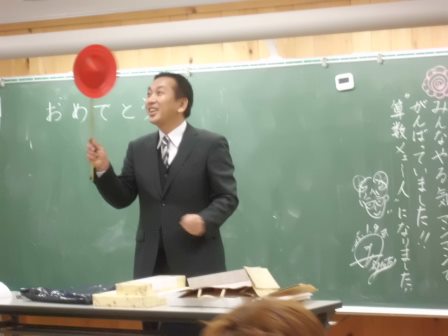 そして、思い出の6年教室で恩師による特別授業。当時の思い出話に、笑顔があふれました。そして、当時に書かれた親からの手紙、二十歳の自分自身に宛てて書いた手紙なども手渡され、感慨深そうでした。恩師の先生からの贈る言葉、「皿回しは、回す方と回される方の力加減、バランスが大事。どちらの立場でも、そのことを忘れずに!」がとても心に響きました。