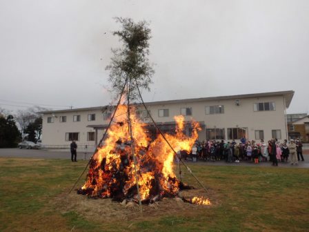 参加しました。あいさつなどが終わり、児童代表が藁で火をつけると、