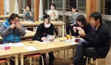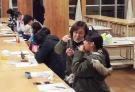 柴田先生から、むし歯や歯肉炎のメカニズムについてご説明いただき、その後デンタルフロスの使い方について教えていただきました。参加した28名の保護者や児童は、鏡を見ながら、また親子で顔を合わせながら、デンタルフロスを使って口の中のケアの仕方を学びました。