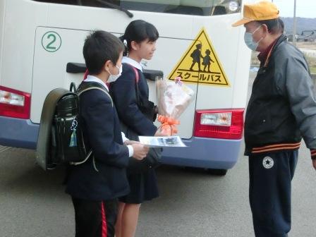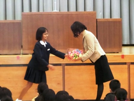 最終日、一番お世話になった鹿島路地区の児童から、「長い間ありがとうございました。」の言葉とともに花束を贈りました。
