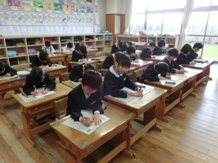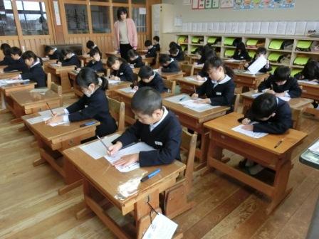 どの子も冬休み中の練習の成果を発揮しようと、シーンと静まり返った教室や廊下で、低学年は鉛筆に、3年生以上は筆に気持ちを込めながら、真剣に作品づくりに取り組んでいました。