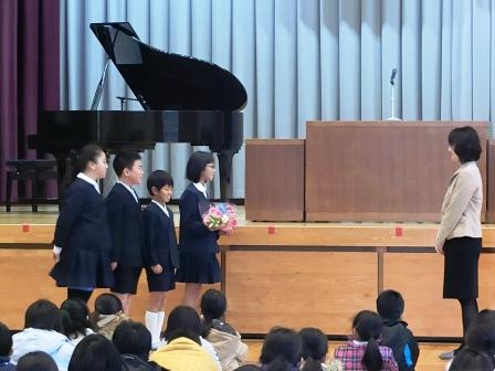 3学期の始業式の後、お別れの会を開き、全校児童を代表して4人の児童が英語で感謝の気持ちを伝えました。