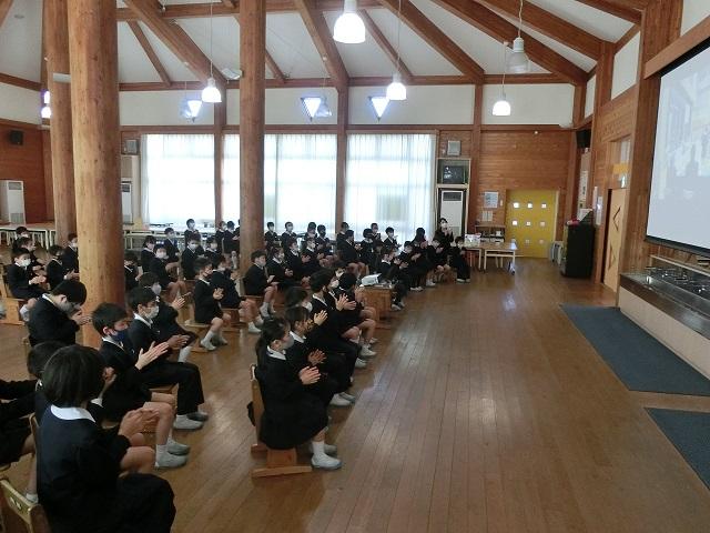 在校生もランチルームで中継画像を見て、6年生をお祝いしました。