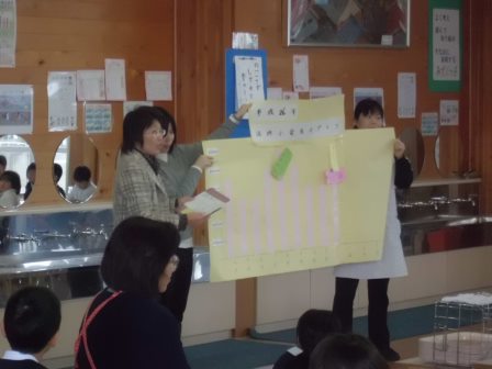 この日は、給食時間にいつも行っている「毎日ホットタイム」の時間を利用して、毎月の電気代の実態を理解しました。グラフに表された電気代を見ると、夏場のエアコン、冬場の暖房費にかなり費用がかかっていることがわかりました。事務主査が説明の中で話した「一人一人の大切に使おうとする心が大事です」という言葉を忘れず、今後のエコ活動に生かしていきたいものです。