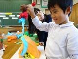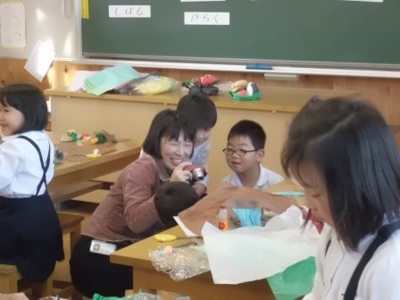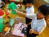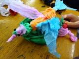 1年生は,図工の時間に色薄紙をくしゃくしゃにして,丸めたりねじったり結んだり重ねたりしてイメージを広げながら,自分の表したいものをつくりました。