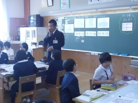 指導主事計画訪問Aでは,演算決定の仕方を既習を活かして考える学習をしました。「値段の違うものを2つ買うからたし算だよ。」や「38円の6つ分だからかけ算だよ。」など,既習を使って考える姿が見られました。また,授業者の提示した演算決定の間違いに気付き,協力して間違いを説明する姿が見られました。